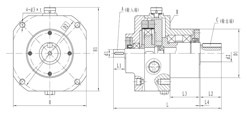 2、B面為安裝基準(zhǔn)面,D1為安裝基準(zhǔn)孔;減速器安裝時,注意保持透氣孔朝上(其他詳見產(chǎn)品說明)
